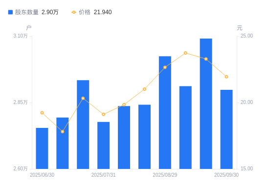 10月9日消息,数据显示,截至2025年9月30日,南山智尚A股股东总户数为2.9万户,较上期(2025年9月19日)减少1933户,降幅6.25%。公司最新A股总股本为5.06亿股,其中流通A股4.35亿股,户均持有流通A股数量为1.5万股,较上期增加938.16股,增幅6.67%;户均持流通A股市值32.91万元,较上期增加1737.91元,增幅0.53%。