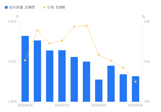 10月9日消息,数据显示,截至2025年9月30日,中建环能A股股东总户数为2.06万户,较上期(2025年9月20日)减少122户,降幅0.59%。公司最新A股总股本为6.82亿股,其中流通A股6.79亿股,户均持有流通A股数量为3.3万股,较上期增加194.19股,增幅0.59%;户均持流通A股市值16.49万元,较上期减少3618.25元,降幅2.15%。