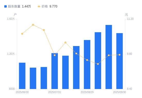 近一年(2024年9月30日至2025年9月30日),恒通股份A股股东户数从1.27万户,增加至1.44万户,增幅13.53%,区间股价上涨19.88%。