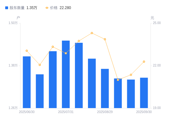 近一年(2024年9月30日至2025年9月30日),辰安科技A股股东户数从1.45万户,减低至1.35万户,降幅7.14%,区间股价上涨33.25%。