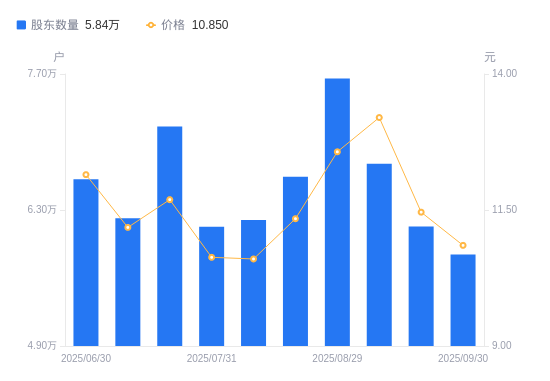 10月9日消息,数据显示,截至2025年9月30日,国芳集团A股股东总户数为5.84万户,较上期(2025年9月19日)减少2892户,降幅4.72%。公司最新A股总股本为6.66亿股,其中流通A股6.66亿股,户均持有流通A股数量为1.14万股,较上期增加537.79股,增幅4.95%;户均持流通A股市值12.37万元,较上期减少791.46元,降幅0.64%。