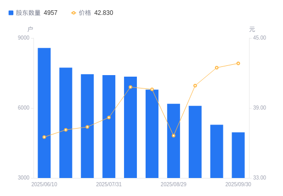 近一年(2024年9月30日至2025年9月30日),鸿铭股份A股股东户数从8160户,减低至4957户,降幅39.25%,区间股价上涨71.11%。