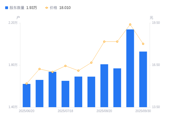 近一年(2024年9月30日至2025年9月30日),英力股份A股股东户数从2.34万户,减低至1.93万户,降幅17.50%,区间股价上涨33.49%。