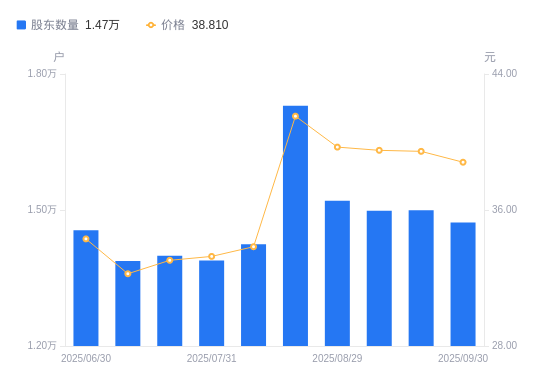 近一年(2024年9月30日至2025年9月30日),博硕科技A股股东户数从1.58万户,减低至1.47万户,降幅6.92%,区间股价上涨43.92%。