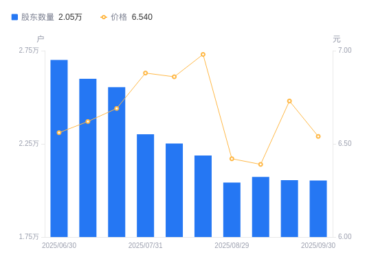 10月9日消息,数据显示,截至2025年9月30日,中旗股份A股股东总户数为2.05万户,较上期(2025年9月19日)减少18户,降幅0.09%。公司最新A股总股本为4.77亿股,其中流通A股3.43亿股,户均持有流通A股数量为1.67万股,较上期增加14.62股,增幅0.09%;户均持流通A股市值10.92万元,较上期减少3072.98元,降幅2.74%。