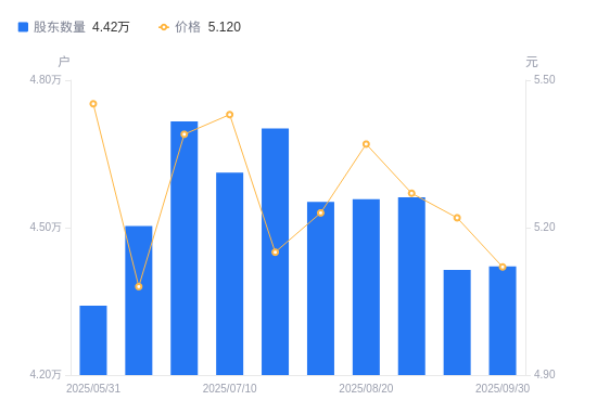 近一年(2024年9月30日至2025年9月30日),华锦股份A股股东户数从5.16万户,减低至4.42万户,降幅14.35%,区间股价上涨16.58%。