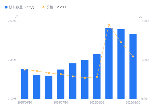近一年(2024年9月30日至2025年9月30日),云南能投A股股东户数从2.33万户,增加至2.52万户,增幅7.98%,区间股价上涨10.13%。