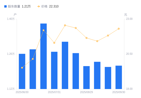 10月9日消息,数据显示,截至2025年9月30日,尤安设计A股股东总户数为1.21万户,较上期(2025年9月19日)增加53户,增幅0.44%。公司最新A股总股本为1.73亿股,其中流通A股1.18亿股,户均持有流通A股数量为9747.22股,较上期减少42.76股,降幅0.44%;户均持流通A股市值21.75万元,较上期增加3843.16元,增幅1.80%。