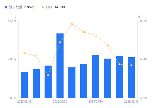 10月10日消息,数据显示,截至2025年9月30日,花园生物A股股东总户数为2.85万户,较上期(2025年9月19日)减少309户,降幅1.07%。公司最新A股总股本为5.43亿股,其中流通A股5.35亿股,户均持有流通A股数量为1.88万股,较上期增加199.4股,增幅1.07%;户均持流通A股市值26.54万元,较上期增加1888.32元,增幅0.72%。