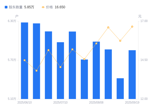 10月9日消息,数据显示,截至2025年9月30日,汉宇集团A股股东总户数为5.7万户,较上期(2025年9月19日)减少1546户,降幅2.64%。公司最新A股总股本为6.03亿股,其中流通A股4.27亿股,户均持有流通A股数量为7495.37股,较上期增加198股,增幅2.71%;户均持流通A股市值11.53万元,较上期减少6222.34元,降幅5.12%。