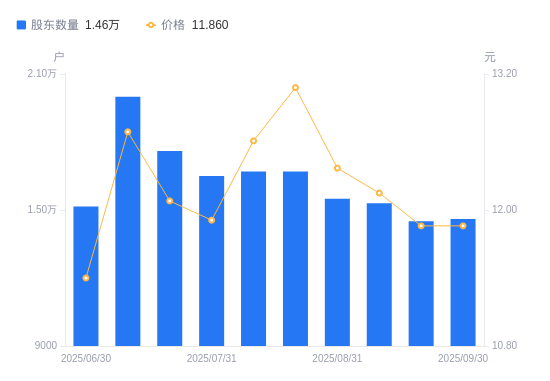 近一年(2024年9月30日至2025年9月30日),晨化股份A股股东户数从1.49万户,减低至1.46万户,降幅2.10%,区间股价上涨40.01%。