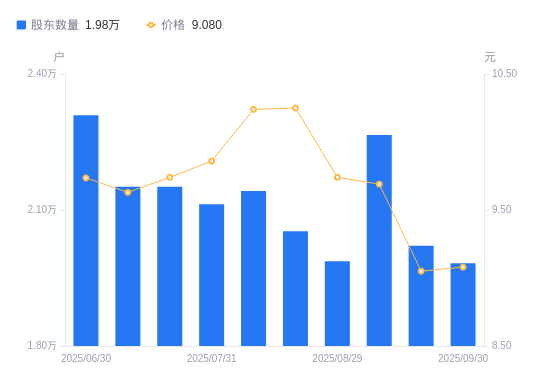10月9日消息,数据显示,截至2025年9月30日,吉大通信A股股东总户数为1.98万户,较上期(2025年9月19日)减少383户,降幅1.90%。公司最新A股总股本为2.73亿股,其中流通A股2.71亿股,户均持有流通A股数量为1.37万股,较上期增加259.38股,增幅1.93%;户均持流通A股市值12.43万元,较上期增加2758.02元,增幅2.27%。