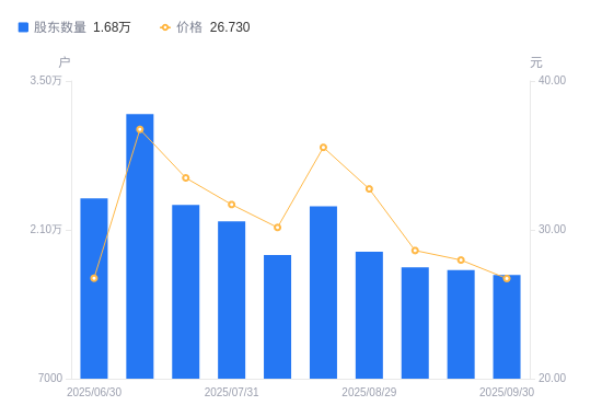 10月9日消息,数据显示,截至2025年9月30日,逸豪新材A股股东总户数为1.68万户,较上期(2025年9月19日)减少467户,降幅2.71%。公司最新A股总股本为1.69亿股,其中流通A股5635.56万股,户均持有流通A股数量为3364.11股,较上期增加91.24股,增幅2.79%;户均持流通A股市值8.99万元,较上期减少1619.55元,降幅1.77%。