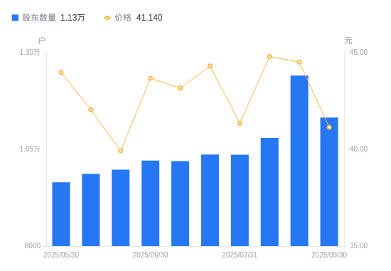 近一年(2024年9月30日至2025年9月30日),江南奕帆A股股东户数从7801户,增加至1.13万户,增幅45.15%,区间股价上涨60.65%。