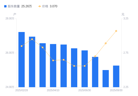 近一年(2024年9月30日至2025年9月30日),钒钛股份A股股东户数从27.51万户,减低至25.26万户,降幅8.18%,区间股价上涨14.55%。