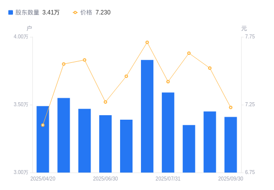 10月9日消息,数据显示,截至2025年9月30日,广农糖业A股股东总户数为3.41万户,较上期(2025年9月10日)减少400户,降幅1.16%。公司最新A股总股本为4亿股,其中流通A股4亿股,户均持有流通A股数量为1.17万股,较上期增加136.11股,增幅1.17%;户均持流通A股市值8.49万元,较上期减少2380.92元,降幅2.73%。
