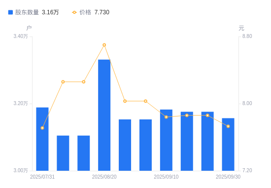 10月9日消息,数据显示,截至2025年9月30日,隆基机械A股股东总户数为3.16万户,较上期(2025年9月20日)减少191户,降幅0.60%。公司最新A股总股本为4.17亿股,其中流通A股4.16亿股,户均持有流通A股数量为1.32万股,较上期增加79.22股,增幅0.61%;户均持流通A股市值10.18万元,较上期减少1089.6元,降幅1.06%。