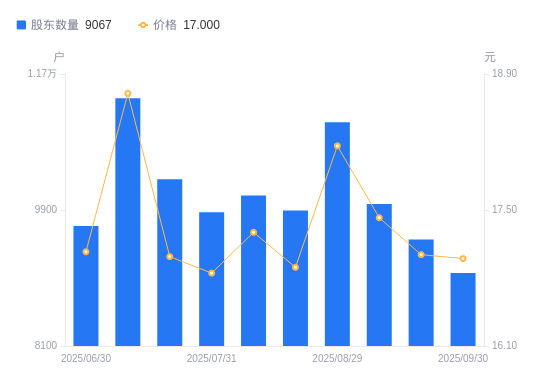 10月10日消息,数据显示,截至2025年9月30日,蕾奥规划A股股东总户数为9067户,较上期(2025年9月19日)减少443户,降幅4.66%。公司最新A股总股本为2.11亿股,其中流通A股1.51亿股,户均持有流通A股数量为1.66万股,较上期增加773.79股,增幅4.89%;户均持流通A股市值28.24万元,较上期增加1.25万元,增幅4.64%。