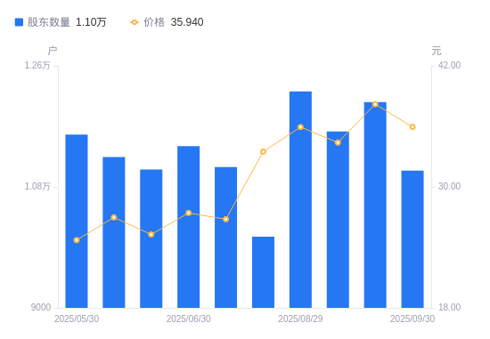 10月9日消息,数据显示,截至2025年9月30日,康平科技A股股东总户数为1.1万户,较上期(2025年9月19日)减少1020户,降幅8.46%。公司最新A股总股本为9600万股,其中流通A股9600万股,户均持有流通A股数量为8694.86股,较上期增加735.33股,增幅9.24%;户均持流通A股市值31.25万元,较上期增加8439.04元,增幅2.78%。