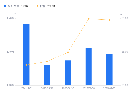 近一年(2024年9月30日至2025年9月30日),同星科技A股股东户数从1.16万户,增加至1.38万户,增幅19.34%,区间股价上涨70.72%。