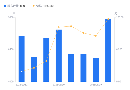 10月9日消息,数据显示,截至2025年9月30日,联合化学A股股东总户数为8898户,较上期(2025年9月19日)增加3035户,增幅51.77%。公司最新A股总股本为1.12亿股,其中流通A股5439.59万股,户均持有流通A股数量为6113.27股,较上期减少3164.56股,降幅34.11%;户均持流通A股市值71.49万元,较上期减少8.02万元,降幅10.08%。