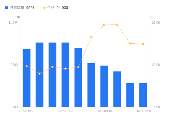 近一年(2024年9月30日至2025年9月30日),海川智能A股股东户数从9135户,增加至9567户,增幅4.73%,区间股价上涨76.19%。