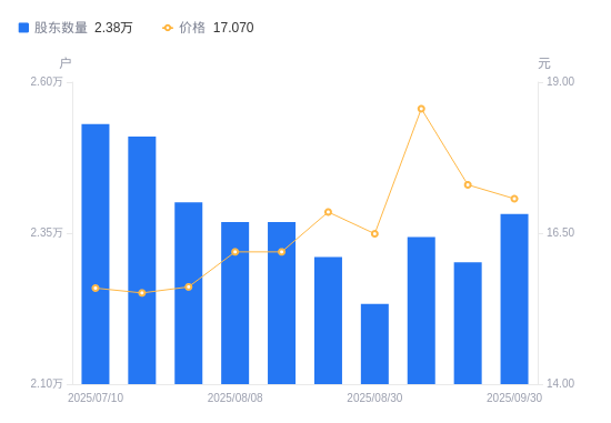 近一年(2024年9月30日至2025年9月30日),钱江摩托A股股东户数从2.52万户,减低至2.38万户,降幅5.52%,区间股价上涨3.14%。