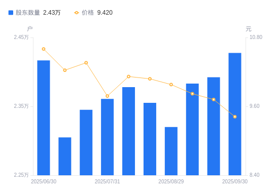 近一年(2024年9月30日至2025年9月30日),渤海轮渡A股股东户数从2.4万户,增加至2.43万户,增幅1.32%,区间股价上涨39.35%。