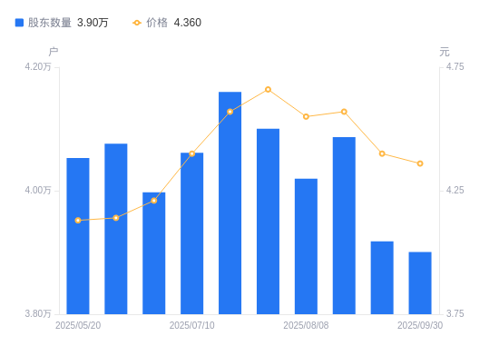 近一年(2024年9月30日至2025年9月30日),福安药业A股股东户数从4.02万户,减低至3.9万户,降幅2.87%,区间股价上涨6.08%。