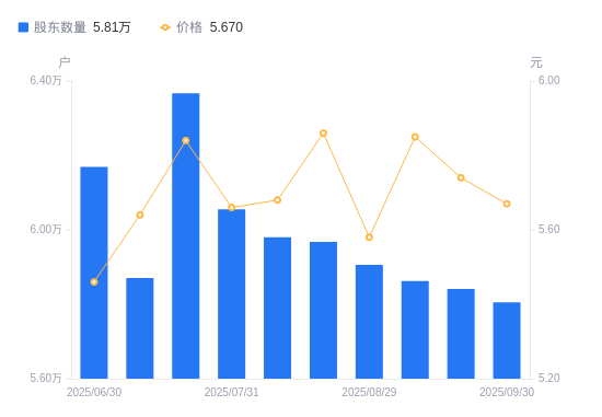 10月10日消息,数据显示,截至2025年9月30日,双星新材A股股东总户数为5.81万户,较上期(2025年9月19日)减少360户,降幅0.62%。公司最新A股总股本为11.41亿股,其中流通A股8.87亿股,户均持有流通A股数量为1.53万股,较上期增加94.12股,增幅0.62%;户均持流通A股市值8.66万元,较上期减少528.77元,降幅0.61%。