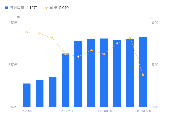 10月10日消息,数据显示,截至2025年9月30日,龙大美食A股股东总户数为4.16万户,较上期(2025年9月19日)增加341户,增幅0.83%。公司最新A股总股本为10.79亿股,其中流通A股10.77亿股,户均持有流通A股数量为2.59万股,较上期减少214.45股,降幅0.82%;户均持流通A股市值12.99万元,较上期减少1.96万元,降幅13.13%。