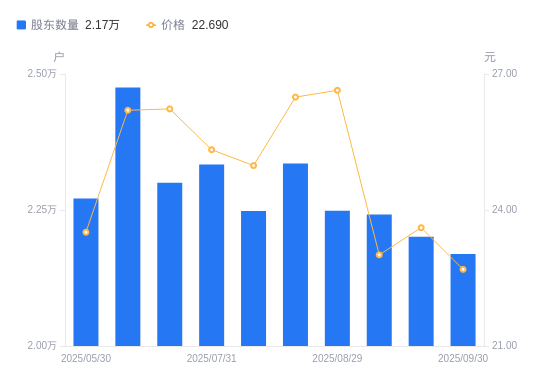近一年(2024年9月30日至2025年9月30日),中科江南A股股东户数从2.36万户,减低至2.17万户,降幅8.05%,区间股价下跌13.10%。