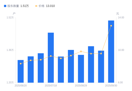 近一年(2024年9月30日至2025年9月30日),倍杰特A股股东户数从1.45万户,增加至1.51万户,增幅3.63%,区间股价上涨64.89%。