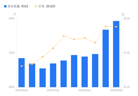 近一年(2024年9月10日至2025年9月10日),银河微电A股股东户数从7611户,减低至7161户,降幅5.91%,区间股价上涨59.43%。