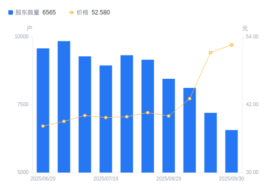 近一年(2024年9月30日至2025年9月30日),力聚热能A股股东户数从1.93万户,减低至6565户,降幅65.99%,区间股价上涨40.63%。