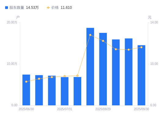 近一年(2024年9月30日至2025年9月30日),长城证券A股股东户数从8.56万户,增加至14.53万户,增幅69.72%,区间股价上涨41.24%。