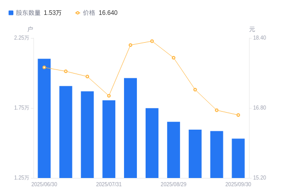 近一年(2024年9月30日至2025年9月30日),中金辐照A股股东户数从1.44万户,增加至1.53万户,增幅6.48%,区间股价上涨18.82%。