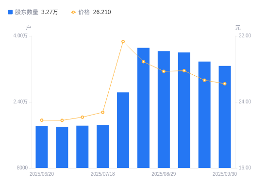 近一年(2024年9月30日至2025年9月30日),奇正藏药A股股东户数从2.01万户,增加至3.27万户,增幅62.54%,区间股价上涨30.71%。