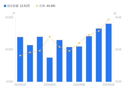 10月10日消息,数据显示,截至2025年9月30日,成飞集成A股股东总户数为12.51万户,较上期(2025年9月19日)增加3728户,增幅3.07%。公司最新A股总股本为3.59亿股,其中流通A股3.59亿股,户均持有流通A股数量为2866.83股,较上期减少88.03股,降幅2.98%;户均持流通A股市值12.71万元,较上期增加6586.36元,增幅5.46%。