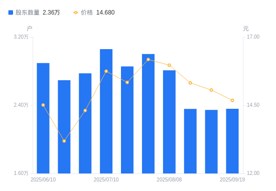 10月10日消息,数据显示,截至2025年9月10日,泰永长征A股股东总户数为2.35万户,较上期(2025年8月29日)减少121户,降幅0.51%。公司最新A股总股本为2.23亿股,其中流通A股2.21亿股,户均持有流通A股数量为9409.92股,较上期增加48.29股,增幅0.52%;户均持流通A股市值14.17万元,较上期减少1706.79元,降幅1.19%。