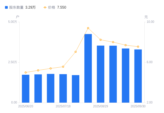 10月10日消息,数据显示,截至2025年9月30日,利德曼A股股东总户数为3.29万户,较上期(2025年9月19日)减少600户,降幅1.79%。公司最新A股总股本为5.44亿股,其中流通A股5.43亿股,户均持有流通A股数量为1.65万股,较上期增加294.91股,增幅1.82%;户均持流通A股市值12.45万元,较上期减少202.31元,降幅0.16%。