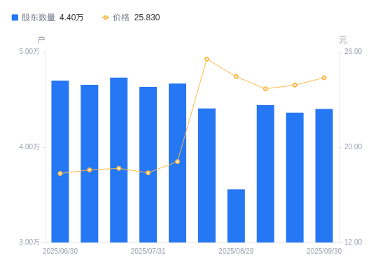 近一年(2024年9月30日至2025年9月30日),博威合金A股股东户数从3.92万户,增加至4.4万户,增幅12.28%,区间股价上涨67.74%。