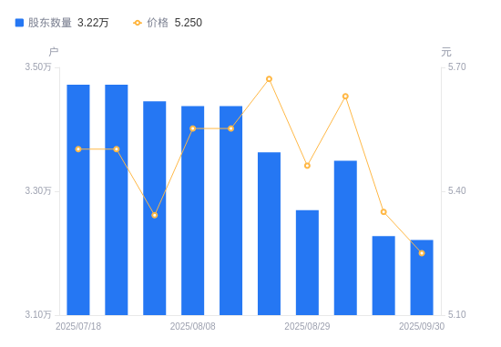 近一年(2024年9月30日至2025年9月30日),鹏鹞环保A股股东户数从3.52万户,减低至3.22万户,降幅8.51%,区间股价上涨18.40%。