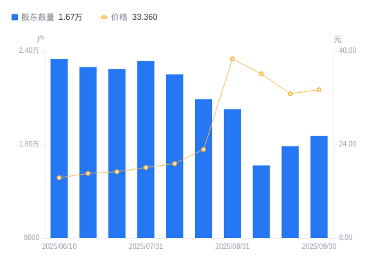 近一年(2024年9月30日至2025年9月30日),通合科技A股股东户数从1.96万户,减低至1.67万户,降幅14.85%,区间股价上涨126.75%。