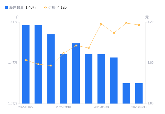 近一年(2024年9月30日至2025年9月30日),*ST名家A股股东户数从1.86万户,减低至1.4万户,降幅24.60%,区间股价上涨83.93%。
