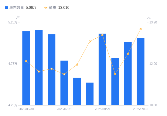 近一年(2024年9月30日至2025年9月30日),商络电子A股股东户数从4.66万户,增加至5.06万户,增幅8.66%,区间股价上涨48.21%。