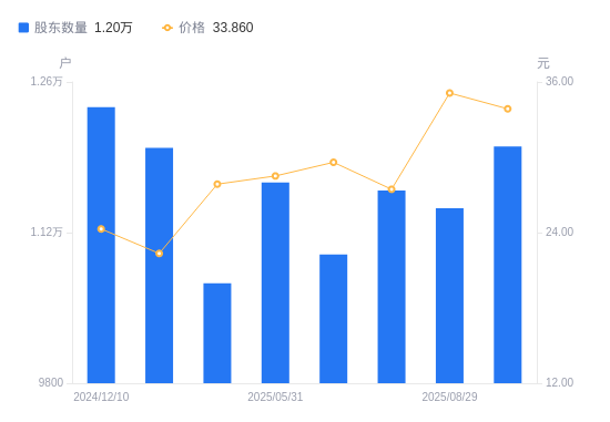 近一年(2024年9月30日至2025年9月30日),迪阿股份A股股东户数从1.34万户,减低至1.2万户,降幅10.35%,区间股价上涨68.63%。