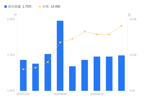 近一年(2024年9月30日至2025年9月30日),金徽股份A股股东户数从1.7万户,增加至1.75万户,增幅2.51%,区间股价上涨28.10%。