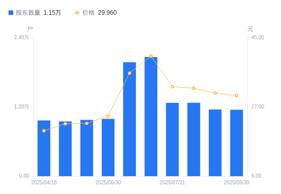 近一年(2024年9月30日至2025年9月30日),欣灵电气A股股东户数从1.07万户,增加至1.15万户,增幅7.50%,区间股价上涨57.02%。
