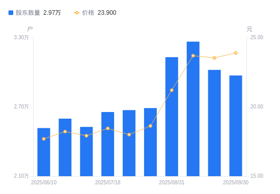 近一年(2024年9月30日至2025年9月30日),立中集团A股股东户数从2.36万户,增加至2.97万户,增幅25.86%,区间股价上涨53.86%。